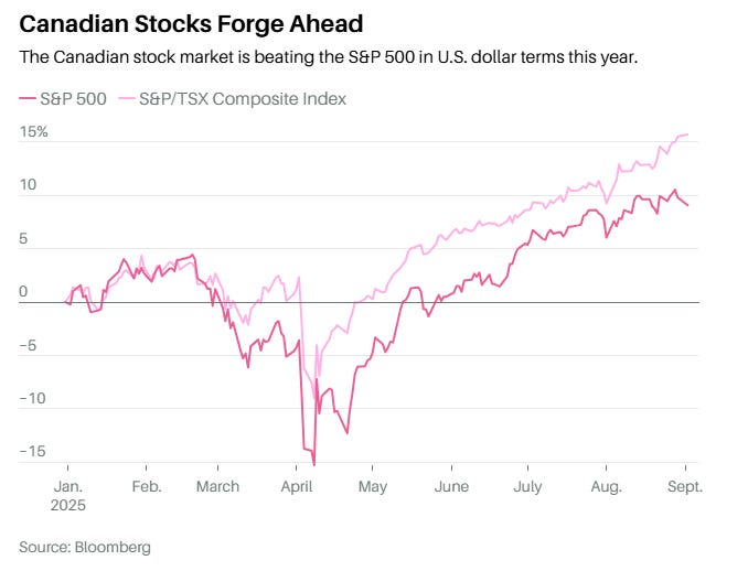 The Canadian interest rate is now at 2.75% from 5% in 2024, and its trade with the US reached 40% of its GDP in 2024. While the effective tariff rate has risen from almost nil to now 6% (and rising), its market is tilted towards energy, gold miners, and banks — natural inflation hedges that provide high dividends.