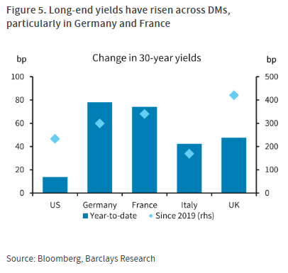 The inconvenient truth for Team UK Doom is that long-term government debt from rich countries is weakening everywhere, sending borrowing costs slowly but surely higher…All around the world, money managers are saying “enough”. The sheer amount of debt they are being asked to absorb is enormous, and the slow wind-down of key long-term pension demand means the appetite particularly for long-dated debt has simply shrunk. If governments want to stretch out repayments far in to the future, they must be willing to pay much higher interest rates to investors.