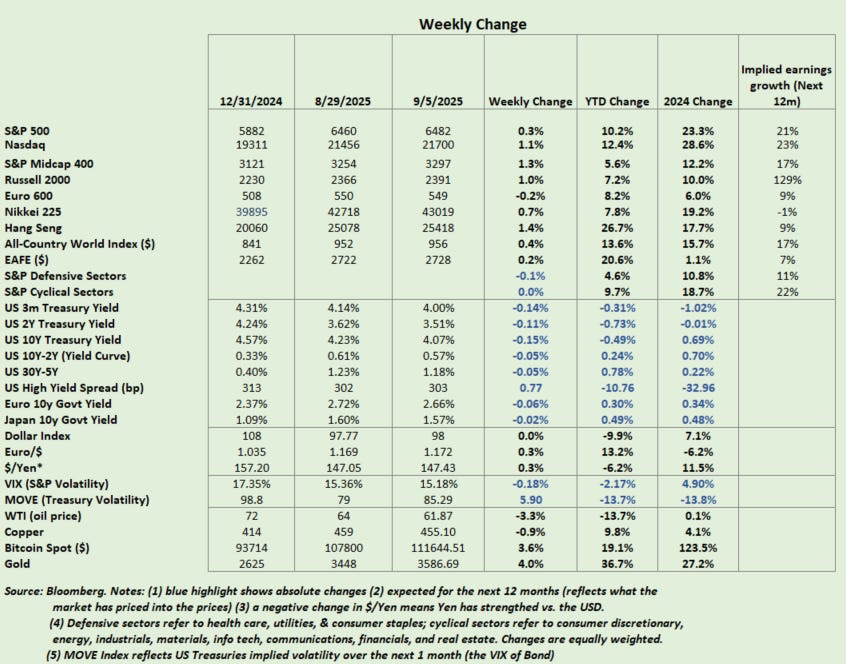 The S&P 500 and Nasdaq still ended positive for the week at 0.3% and 1.1% respectively, while the US 2-year Treasury yield fell 11bp to 3.51% and the 10-year yield fell 15bp to 4.07% and bond volatility (MOVE Index) jumped almost 6 points. Gold surged 4% to $3586.69 while oil (WTI) fell 3.3% to $61.87 this past week (see Peak Gold in One Chart Not to Miss below).