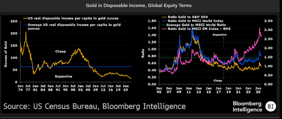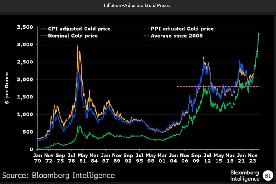With gold at above $3,500/oz, the inflation-adjusted gold price (averaging CPI and PPI-adjusted inflation at around $3,316) has become the most expensive since the US left the gold standard in 1974 (Bloomberg Economics).