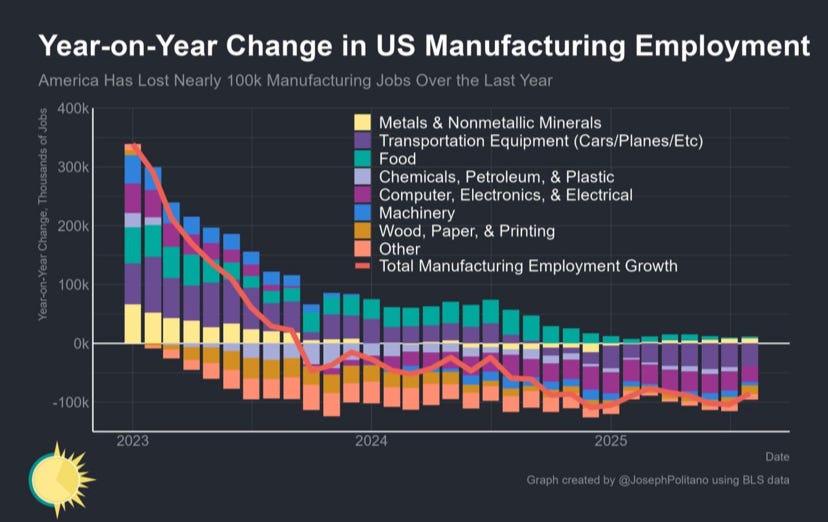 ’s chart below shows how weak the manufacturing jobs have been, falling 85k year-over-year:The futures market fully expects a rate cut in September and contemplates a 50bp cut (not likely) and a cumulative 150bp cut by late 2026.