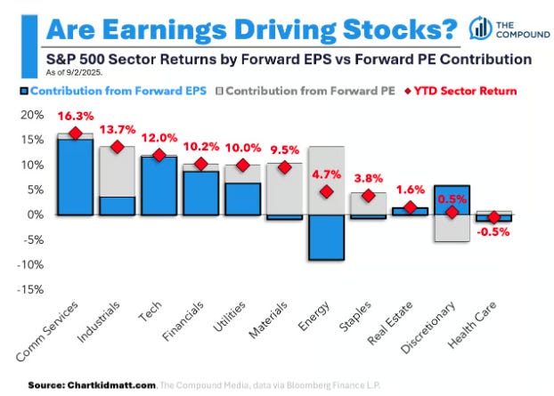 You can see that communications and tech sector returns are almost entirely driven by forward EPS rather than forward P/E (multiple expansion), so they are not necessarily expensive. However, industrials, materials, and energy forward EPS have been hurt by tariffs, but stock prices have not budged yet.