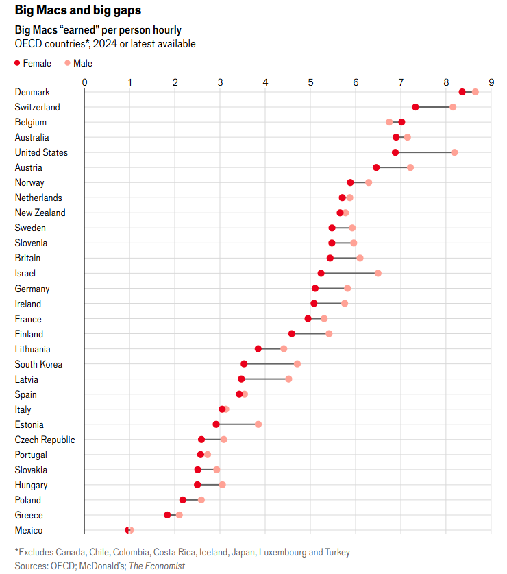 Gender Pay Gap: Cross-market analysis reveals persistent gender wage disparities averaging 0.5 Big Mac equivalents per hour across OECD countries. The US shows the largest differential at 1.31 units, while South Korea exhibits the highest proportional gap at 25%. Belgium is the only market with inverted gender dynamics, where women out-earn men by 0.27 units hourly.