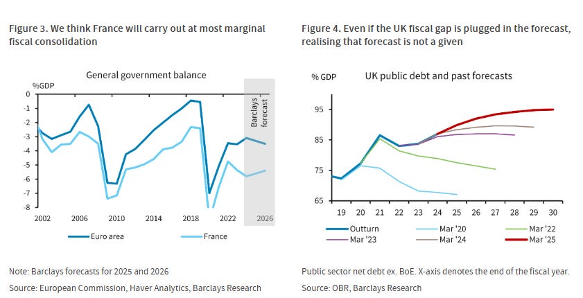 The French Prime Minister will call a confidence vote on September 8 to gauge the parliament’s resolve for budget-reducing policies. The French fiscal deficit has been stuck at over 5.5% GDP, while the UK public debt path is rapidly rising, with the chancellor calling for a 1% reduction in fiscal deficit, which will hit economic growth.