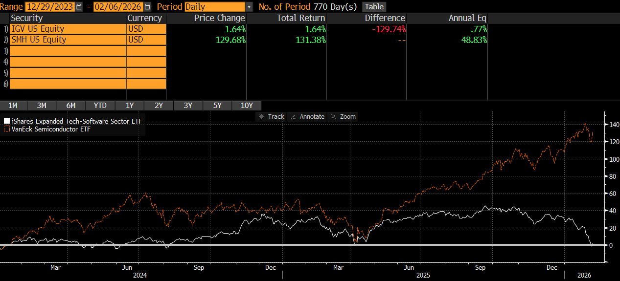 Since the end of 2023, IGV on average rose less than 1% per annum while SMH (Vanguard semiconductor ETF) rose an annualized 49% (see below chart).