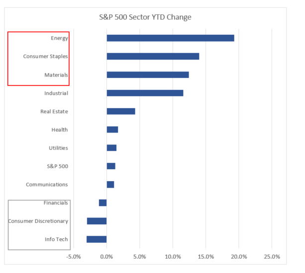 …companies within the Energy, Materials, Staples, and Industrials sectors are crushing it while companies in Comm Services and Financials are lagging. Tech is mostly bad (50% of companies are either in the worst or second to worst decile of YTD performance).~Chart Kid Matt