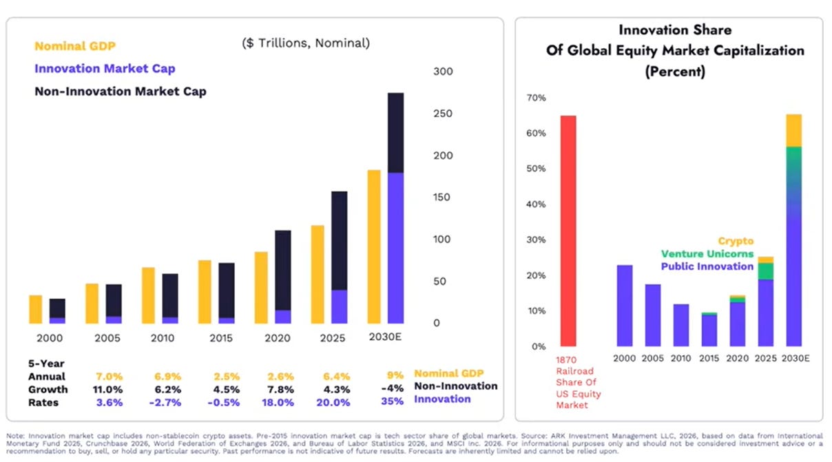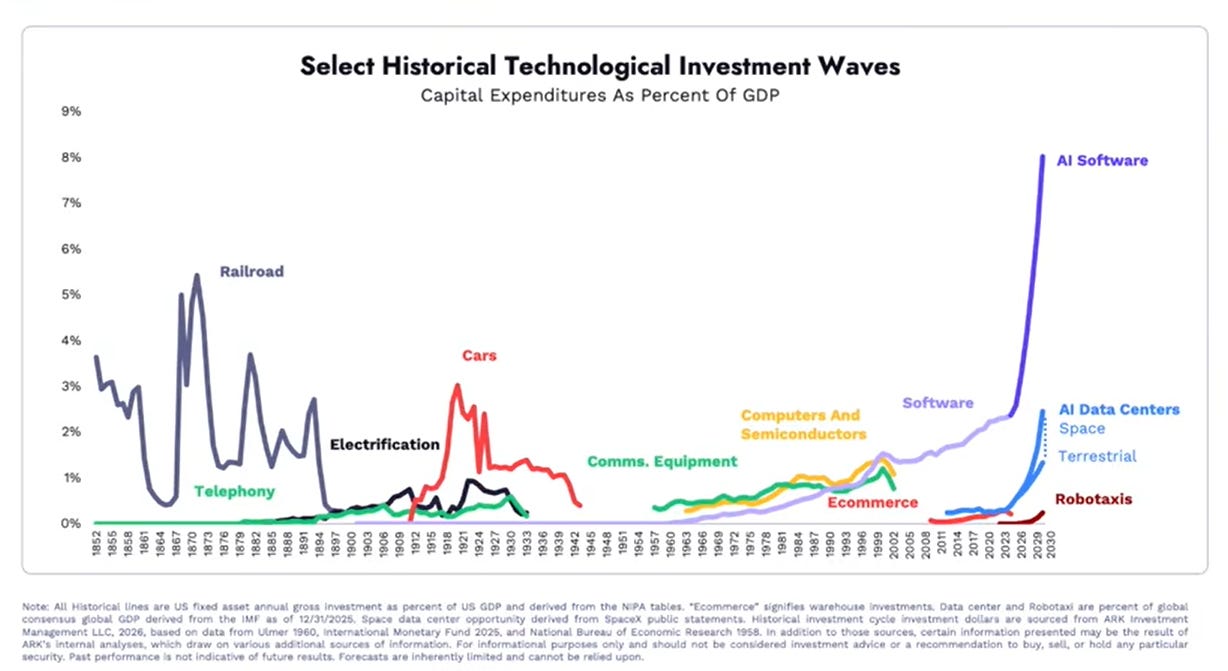 “The fibre (referring to the telecom companies’ overspending in the 90’s and 2000’s) went dark, but the GPUs are alive”, said Cathie Wood (YouTube). According to her, we are at the beginning of the AI revolution, and the AI spending cycle will be much longer than the telecom era. Disruptive technologies is expected to grow to dominate global markets, as her charts from the Big Ideas 2026 report show.