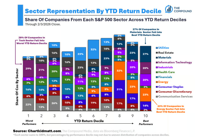 The following is a chart showing the YTD return (data through 2/3/26) by Chart Kid Matt of each of the 11 S&P 500 GICs sectors. The takeaway: