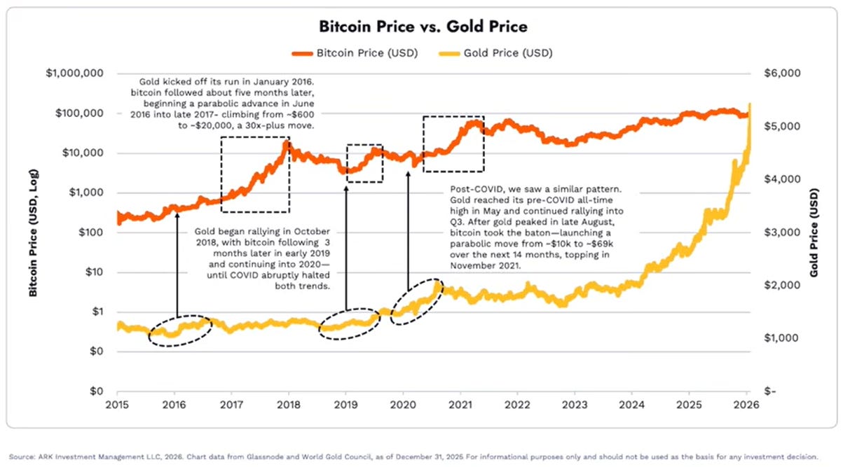 However, Cathie Wood from Ark Invest recently argued that bitcoin’s parabolic rise has traditionally followed that of gold (see below chart). The fact that gold and silver have stabilized after the recent rout may help.