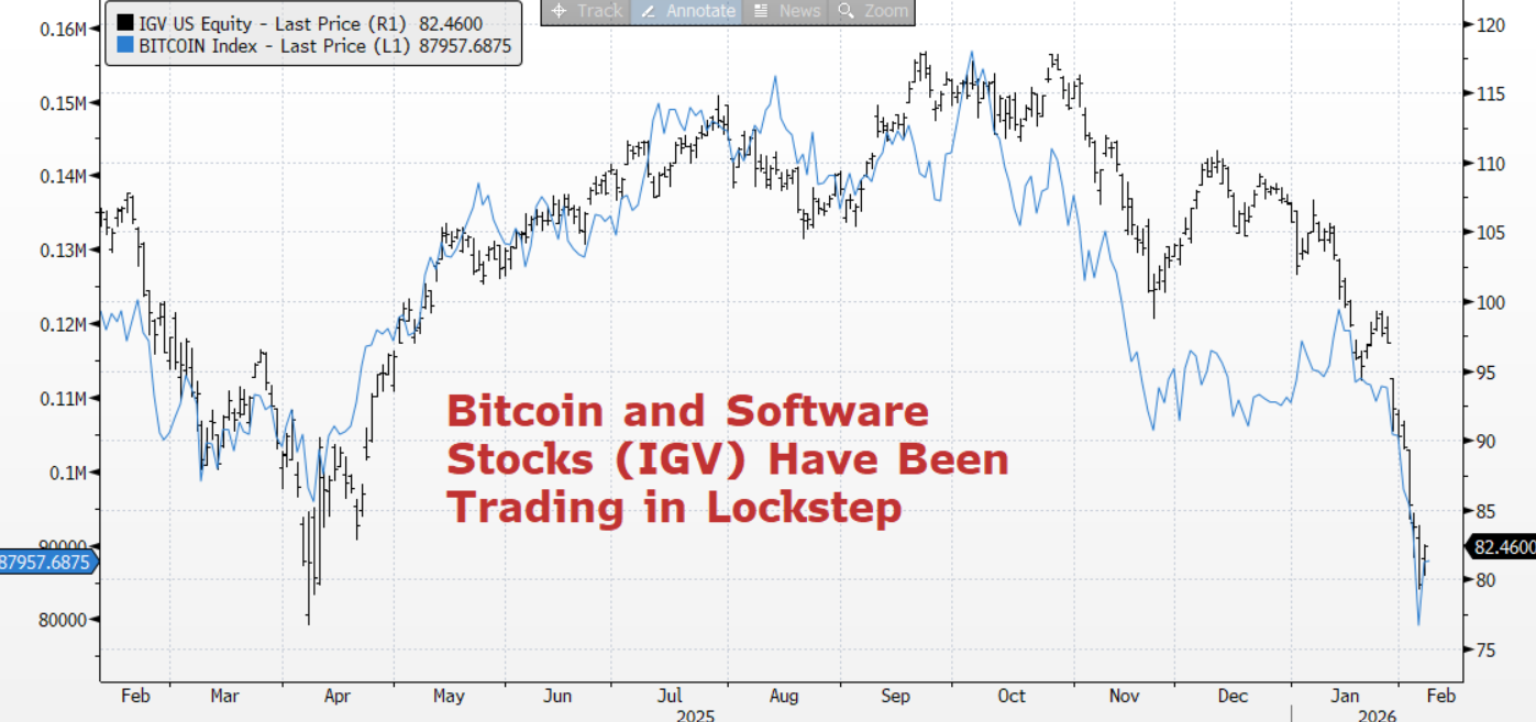 Crypto investors have also been facing its worst “winter” with bitcoin dropping ~50% from its October 2025 peak, coincidentally as software stocks collapsed ~32% from its September 2025 peak. Sometimes called “digital gold” or “digital cash”, crypto currencies have failed to be the hedge during times of geopolitical uncertainty and are now more correlated with software (internet stocks) than with the overall Nasdaq index. Quantum computing is believed to be able to crack cryptography. Coupled with deleveraging (Yen carry trade unwinding due to rising Japanese bond yields and a potential Yen intervention) and bullish investors like Strategy not being to add more to positions, bitcoin winter has gotten worse (see more on Econ/Invest #2).